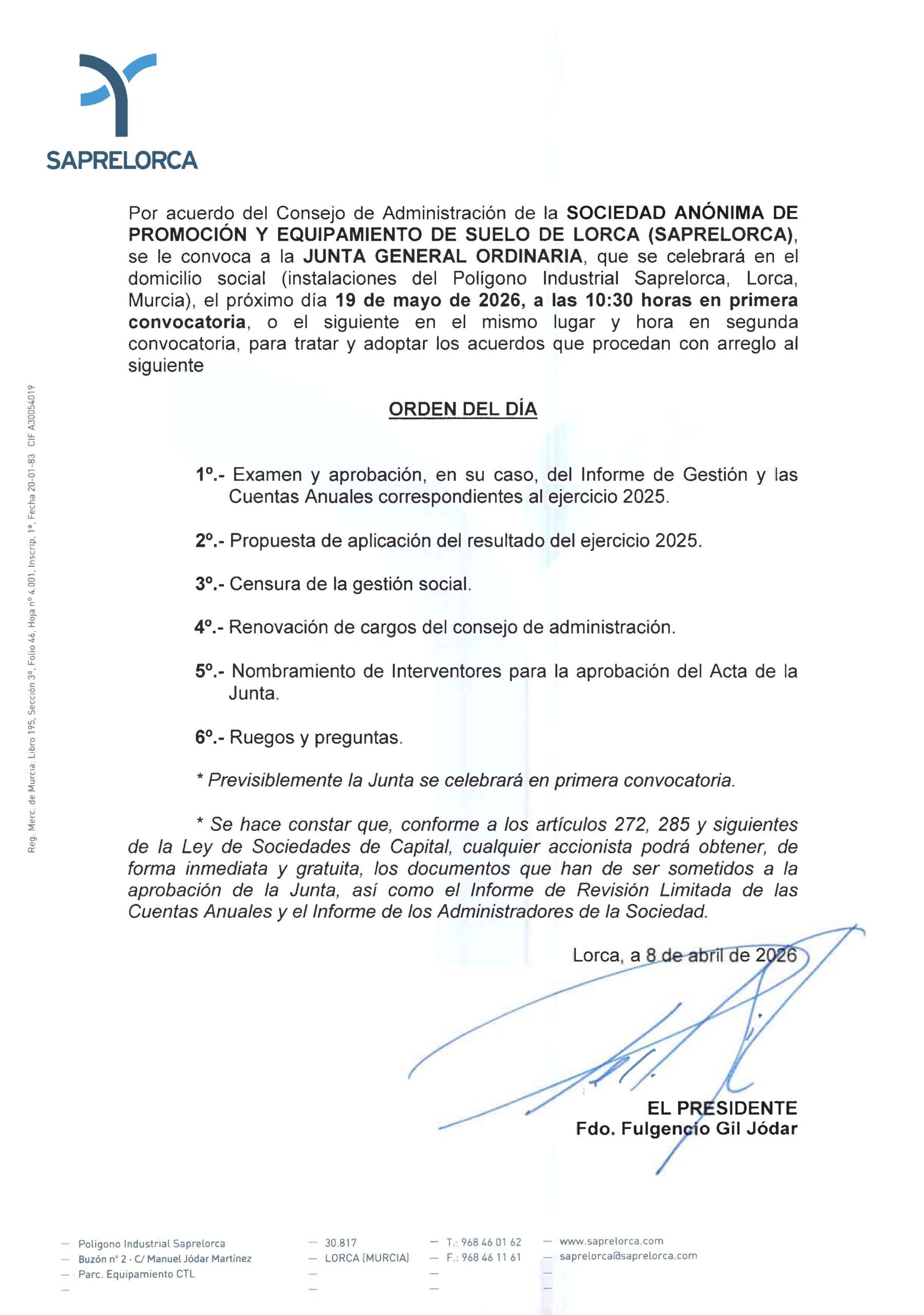 Por acuerdo del Consejo de Administración de la SOCIEDAD ANÓNIMA DE PROMOCIÓN Y EQUIPAMIENTO DE SUELO DE LORCA (SAPRELORCA), se le convoca a la JUNTA GENERAL ORDINARIA,que se celebrará en el domicilio social (instalaciones del Polígono Industrial Saprelorca, Lorca, Murcia), el próximo día 19 de mayo de 2026, a las 10:30 horas en primera convocatoria, o el siguiente en el mismo lugar y hora en segunda convocatoria, para tratar y adoptar los acuerdos que procedan con arreglo al siguiente